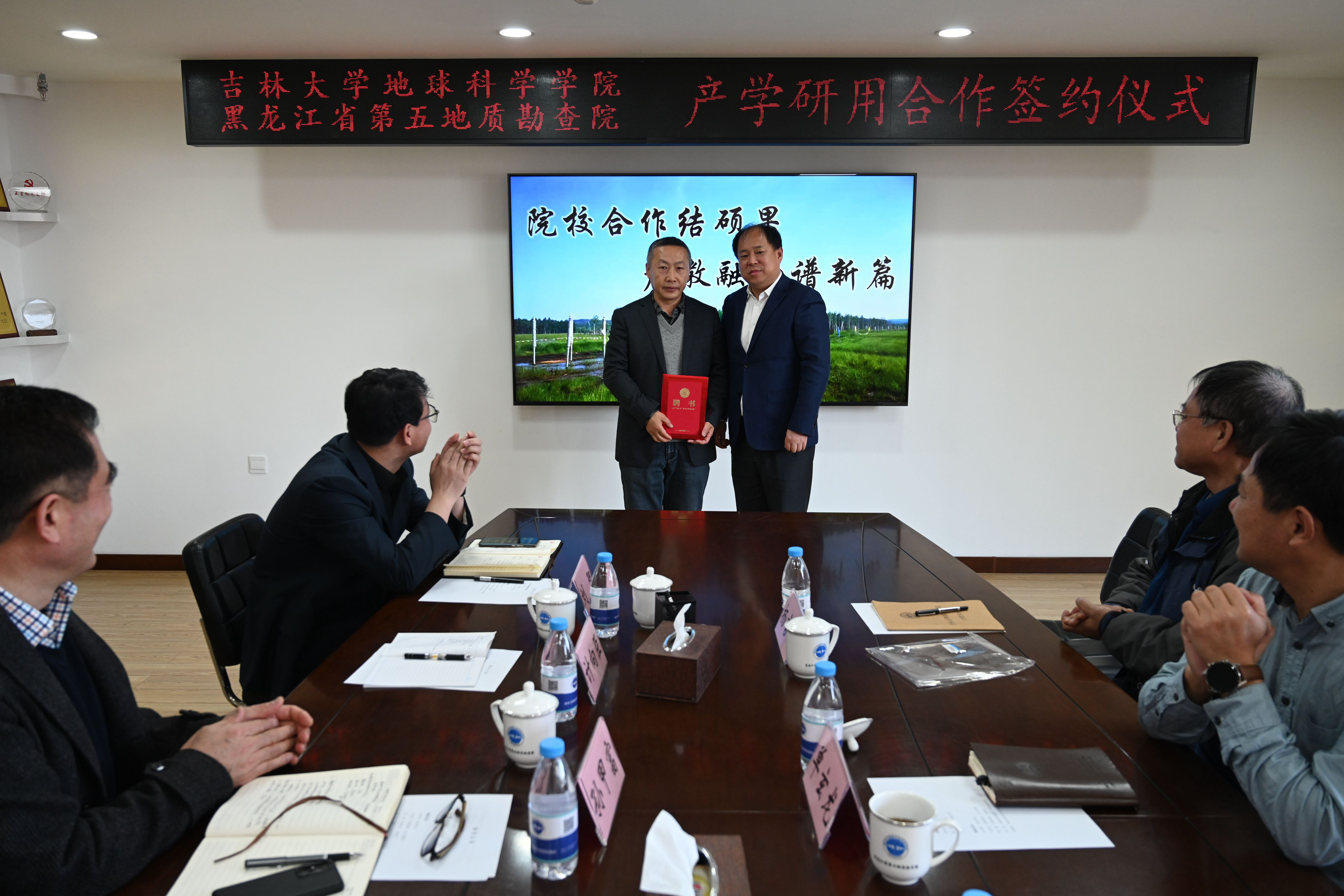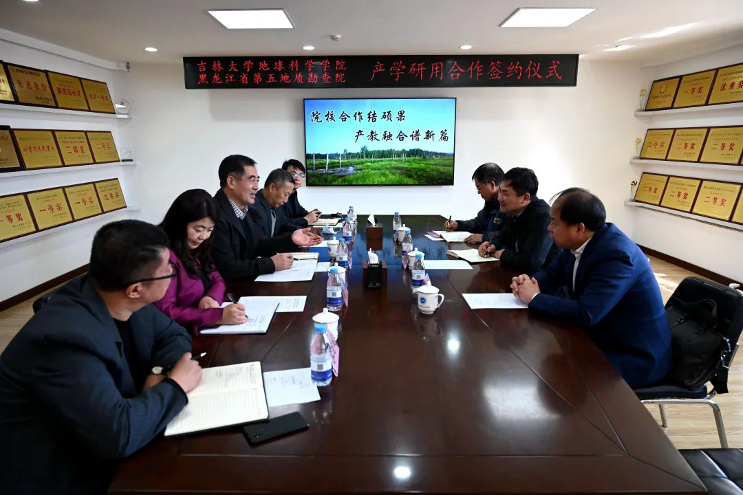 与黑龙江省第五地质勘查院举行了产学研用合作签约暨基地揭牌仪式,仪式在黑龙江省第五地质勘查院办公楼举行。学院院长单玄龙、党委书记杨洲、资源工程系主任杨言辰,黑龙江省第五地质勘查院党委书记孙甲富、总工程师计向臣、副院长雷敏及相关工作人员等8人参加了签约仪式。