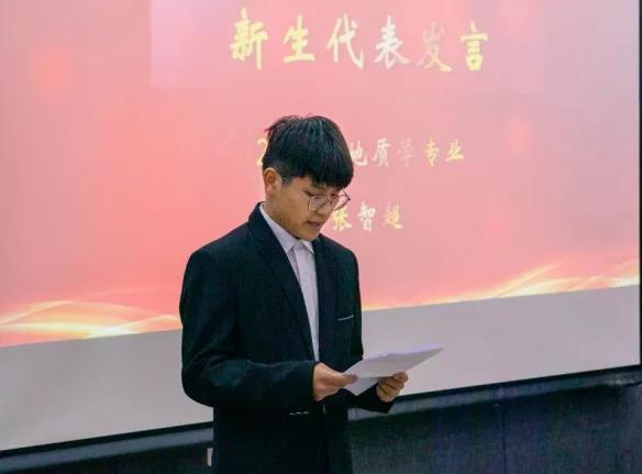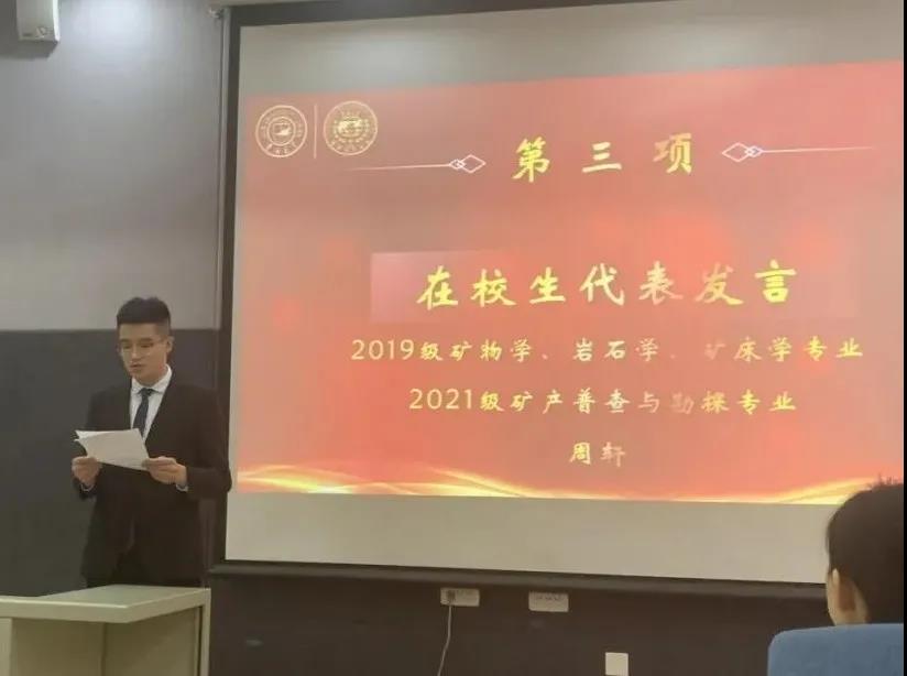 典礼上,2021级地质学专业张智超和2021级矿产普查与勘探专业直博生周轩分别代表新生和在校生进行发言。希望同学们能潜心科研,知行合一,赓续地质基因,传承吉大精神。
