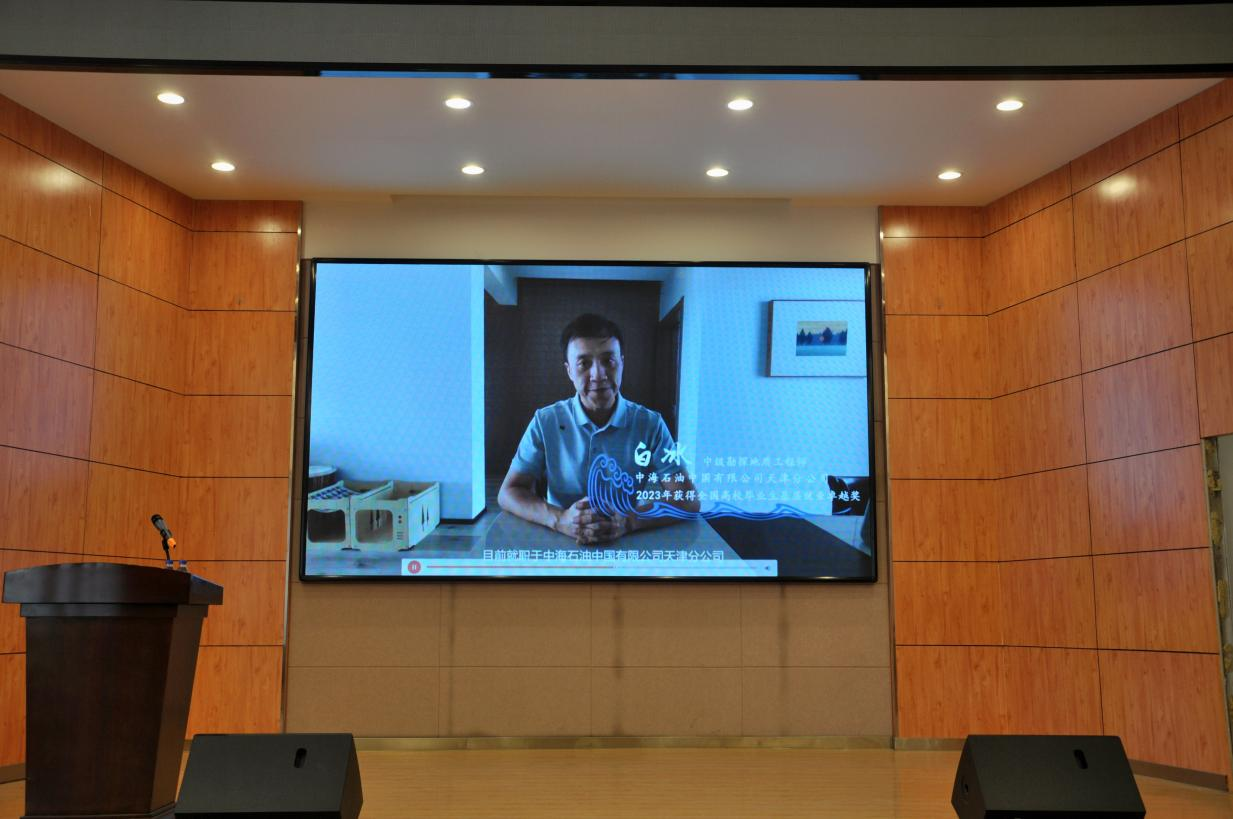 学院校友代表中国科学院广州地球化学研究所副研究员、国家优青项目获得者张修政,西南大学地理科学学院教授、博士生导师、国家优青项目获得者樊磊,中海石油中国有限公司天津分公司中级勘探地质工程师、2023年全国高校毕业生基层就业卓越奖获得者白冰分别以视频的方式向同学们分享了他们在吉大的求学时光和当前的工作经历,提醒同学们“机会总是留给有准备的人”,希望同学们扎实专业本领,开拓眼界格局,用好在吉大求知问学的黄金时期,交出吉大青年、地学青年给新时代的完美答卷。