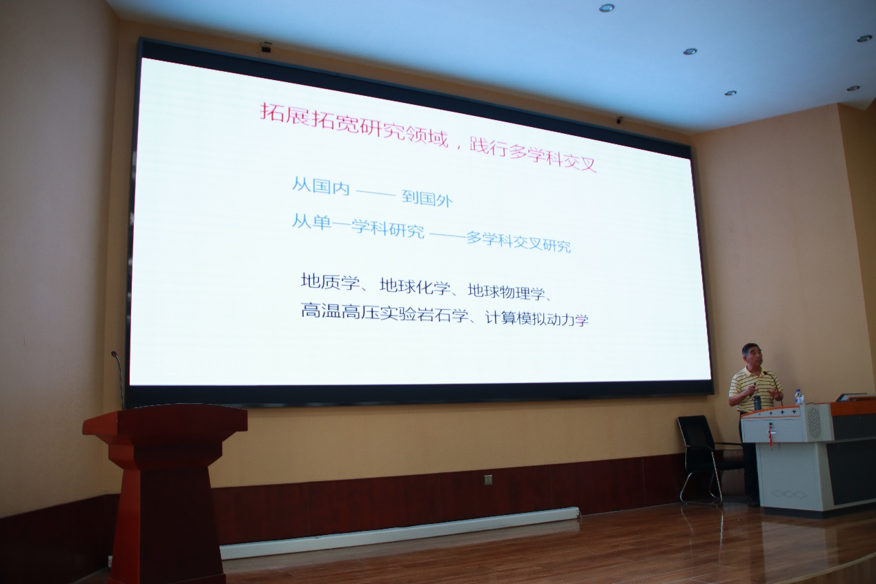 报告会上,许文良教授结合他国内国外的求学之路、国际会议的参与过程和丰富的野外实践经历,开拓了学生的国际视野、激发了学生的专业兴趣。许文良教授鼓励专业的交流融合,他自己兼修人文与经济管理专业,其在管理方面也具备深厚的知识储备。之后,许教授以地球深部水-碳循环及其效应为例,既向大家展示了吉大地学的优势所在,又充分体现“地球系统科学”这一21世纪的重要地学命题,强调各圈层的相互作用,并延展出深部运动对地表环境宜居性的影响。最后许文良教授以“地球深部动力学创新团队”的创立为例,强调吉大师生应当拓宽专业研究领域,践行多学科交叉融合,提升学生们的专业素养。许文良教授在报告过程中谈到自己在阿曼地区观察到出露良好的蛇绿岩套及其上部覆盖的枕状玄武岩时,兴奋与喜悦之情溢于言表,许教授对于地学真挚的热爱感染着报告厅里的每一个人。