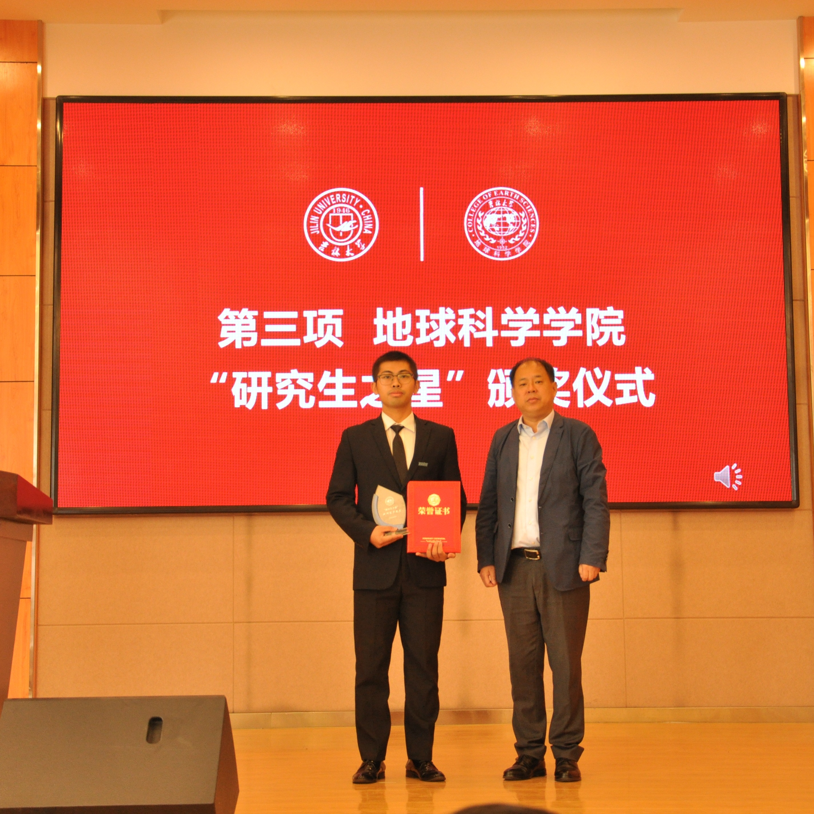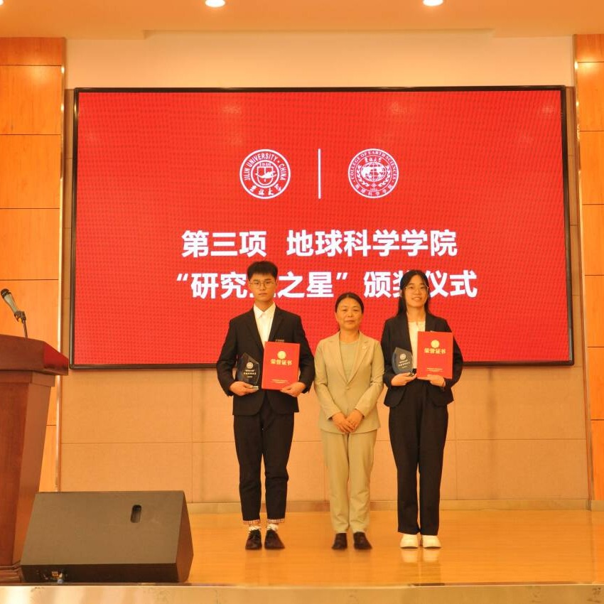 “研究生之星”的决定》。学院党委书记杨洲、学院院长单玄龙,专业学位培养指导委员会主任委员王璞珺、行政副院长苗广文、地质学系主任李世超、国土资源系主任王冬艳、博士生导师杨晨分别为“研究生之星”颁发荣誉证书和奖杯。