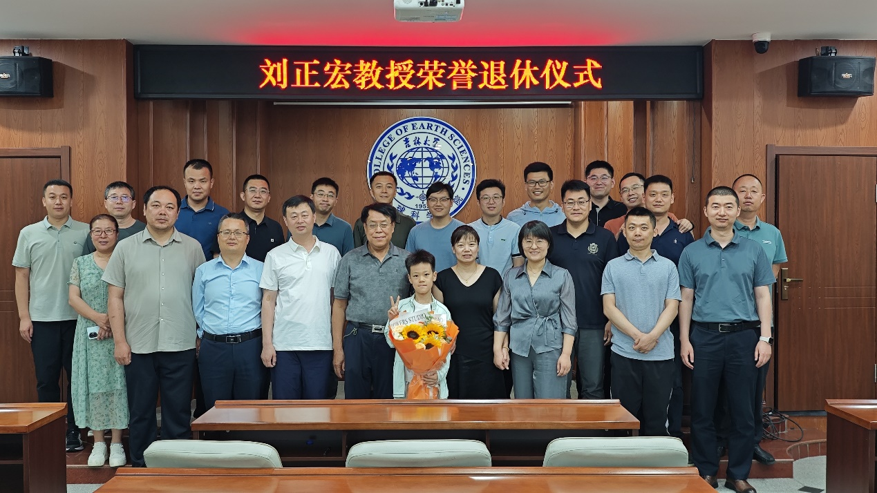 仪式尾声,衣长涛书记和钱烨副院长代表学院向刘正宏教授颁发了荣誉证书及纪念品。随后,构造地质学教研室的老师们和刘老师的学生们纷纷上前,与敬爱的刘老师合影留念。