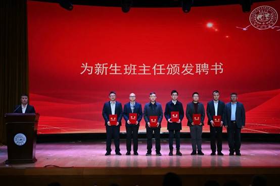 共遴选9名专业教师担任新生班主任。典礼上,新聘班主任们的成长经历和学术成就赢得了全场师生的热烈掌声,衣长涛书记为班主任颁发了聘书并合影留念。