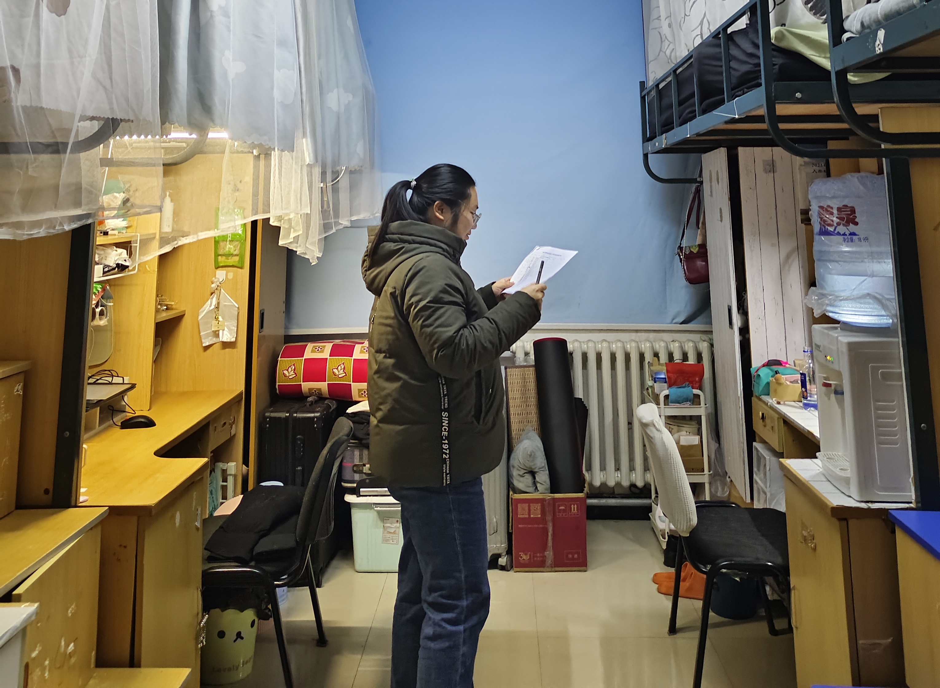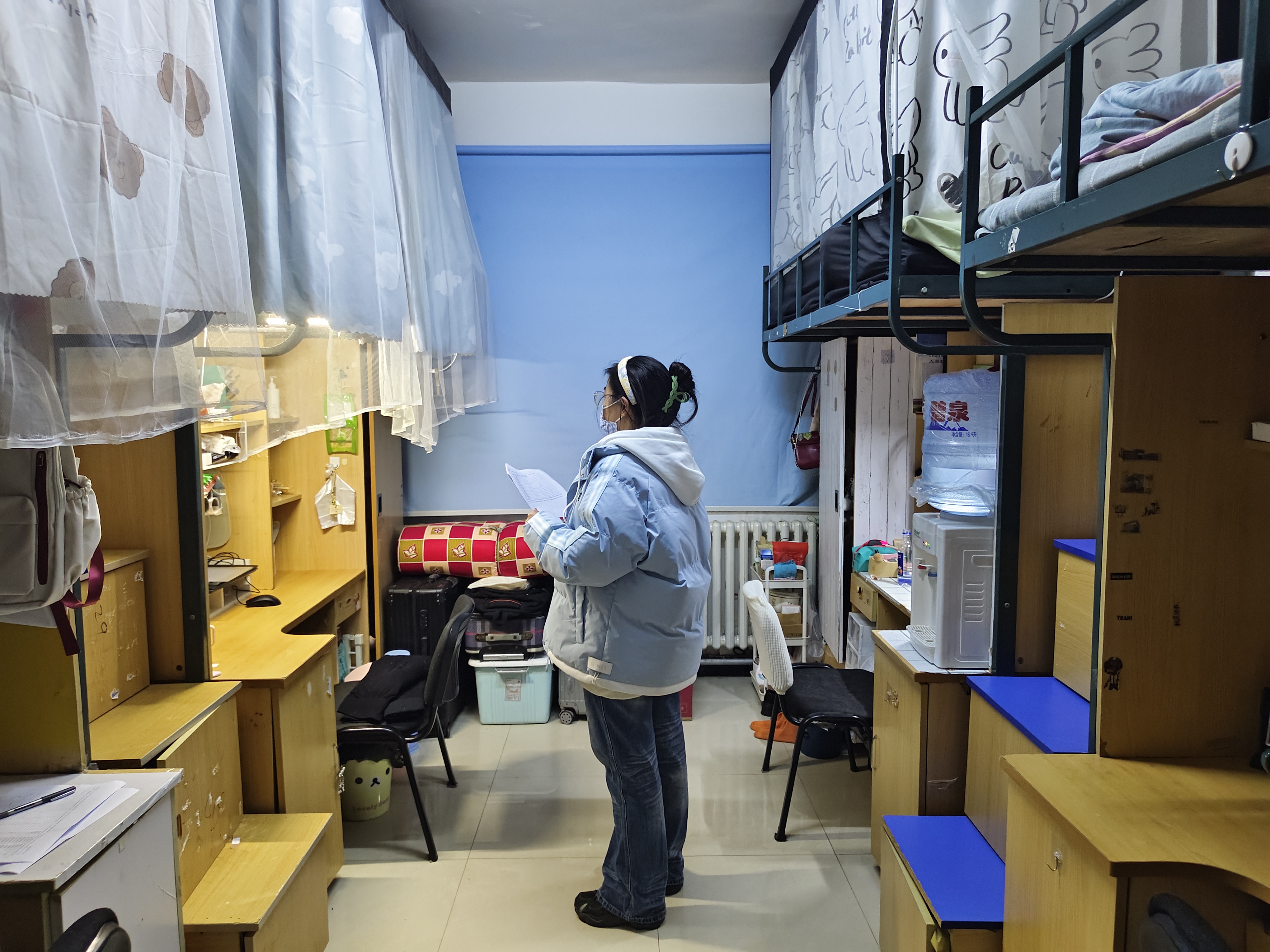 检查过程中,工作小组依据《标准》,按计划对学院所有研究生寝室进行了拉网式、全覆盖的自查工作。检查内容不仅涉及寝室内务卫生,更将安全隐患排查作为重中之重,确保研究生人身和财产安全。工作小组着重检查了寝室内是否存在大功率电器、易燃易爆物品及管制器具等安全隐患,将寝室安全情况作为衡量寝室管理质量第一标尺,严把寝室安全大关。在确保寝室安全达标基础上,工作小组严格按照《标准》逐项打分,对寝室内的学习用品、生活用品摆放,床上用品叠放,床下及书桌下物品整理,以及被褥、衣物等是否有异味等进行了细致检查。此外,工作小组还借此契机,积极了解研究生的思想状况,关注研究生在日常学习生活中遇到的重难问题,倾听需求,及时解决,着力做好研究生生活保障工作。