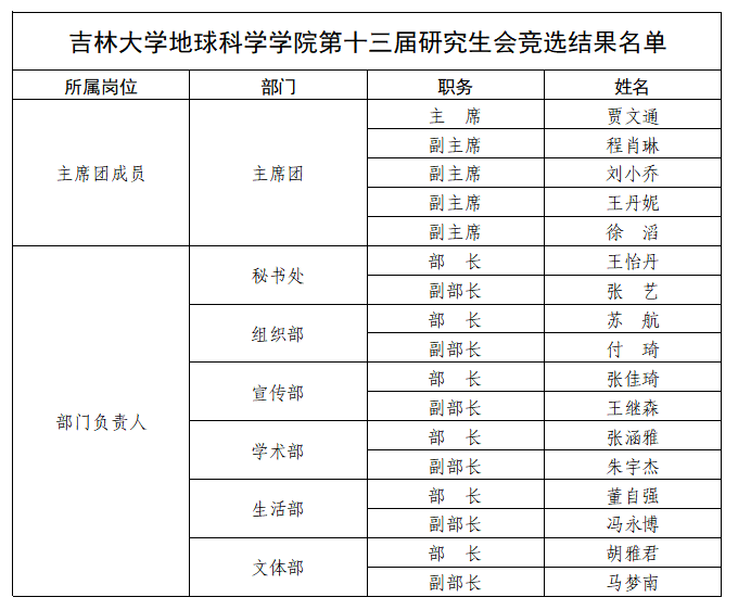 为进一步加强学院研究生干部队伍建设,更好地选拔台湾a片 研究生会新一届学生干部,本着“公平、公正、公开”的原则,经个人自愿申报、资格审查、竞职演讲、民主投票,综合现实工作表现进行考察,最终确定台湾a片 第十三届研究生会学生干部名单,现予以公示: