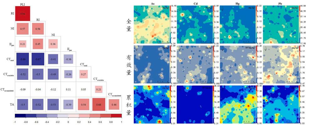 图1土壤重金属全量、有效量和作物富集量空间分布与评价结果Pearson相关性检验