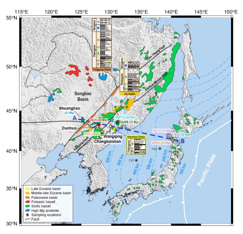 图1. 东北亚陆缘新生代玄武岩和新生代早期沉积盆地分布图