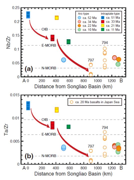 图3. 东北亚陆缘新生代玄武岩的Nb/Zr和 Ta/Zr比值与松辽盆地的距离