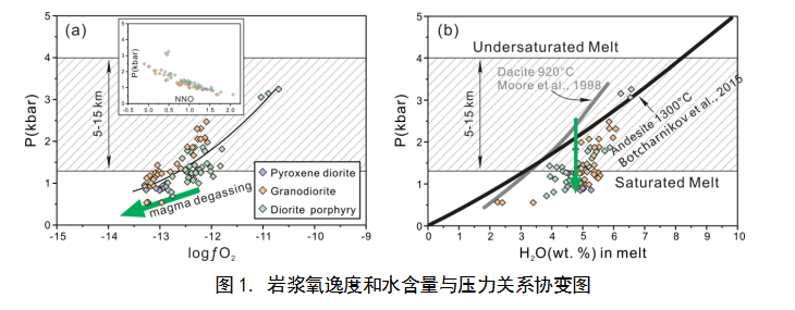 1. 依据角闪石地球化学组成获取的岩浆物理化学属性表明闹枝成矿系统中岩浆为中等氧化、富水岩浆;相对于深部地壳,岩浆在浅部地壳经历了长时间的存储和演化过程,而且岩浆脱气和流体出溶作用使岩浆氧逸度和含水量发生明显降低(图1)。