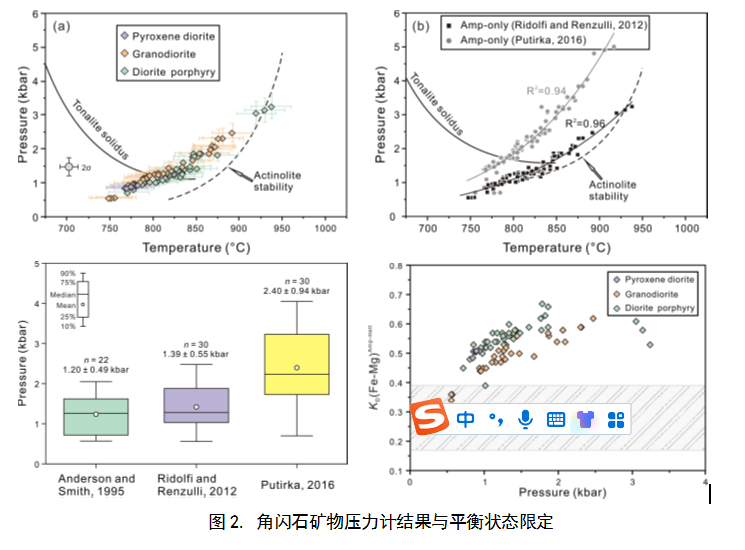2. 角闪石矿物普遍出现于中–酸性侵入岩内,在岩浆冷凝结晶过程中矿物生长与熔体保持物理化学态平衡,因此依据该矿物成分角闪石结晶压力条件为3.25 ± 0.37 kbar 至0.56 ± 0.06 kbar(图1),横跨中-上地壳层位。在矿物形态学研究基础上,KD(Fe-Mg)mineral-melt系数被用于约束是否角闪石与共生熔体达到平衡;结果表明仅个别低压角闪石处于平衡状态下,对应的压力范围为0.56~0.57 kbar(图2),指示岩体最终就位深度为<2.1 km。