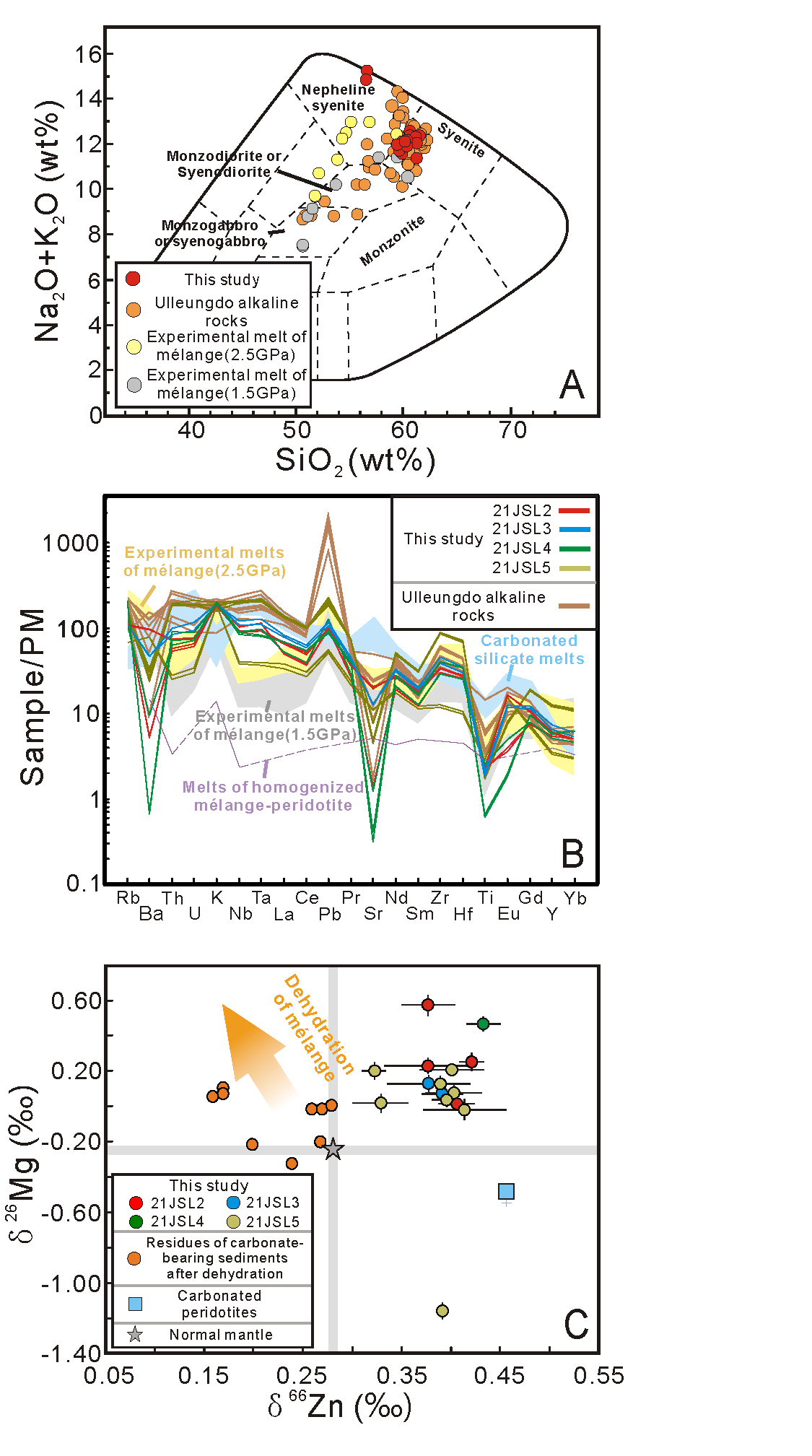 2. 限定了俯冲混杂岩底劈熔融作用的起始深度。相较于天然混杂岩实验熔体,本次研究的部分样品具有更高的轻稀土元素和高场强元素含量,与碳酸盐化硅酸盐熔体一致(图2B)。样品Sr-Nd-Zn同位素组成进一步指示了碳酸盐化橄榄岩端元的参与(图3B和3C),且碳酸盐类型以菱镁矿为主(图3B和3C)。因此,可以将相互作用深度限定在软流圈,这比之前的实验岩石学等方面工作推测的俯冲混杂岩底劈熔融的起始深度更深。