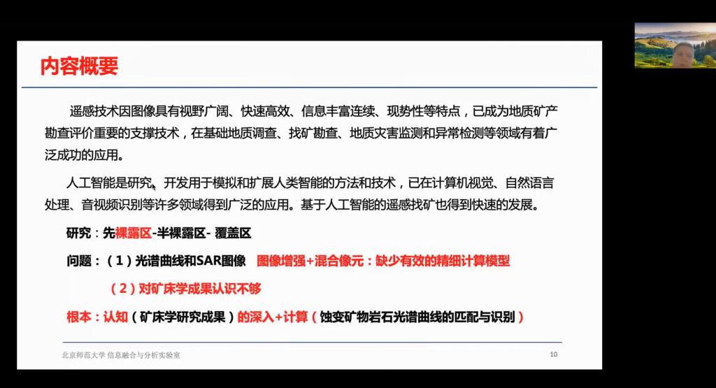 余先川老师首先介绍了其所在的北京师范大学空间信息处理与分析实验室的基本情况、研究方向及取得的主要成果,然后重点介绍了基于新一代人工智能技术的遥感地质找矿的基本思路、研究方法、未来方向等,最后余老师总结了大数据、人工智能、机器学习等在地学领域的应用现状及未来发展趋势。