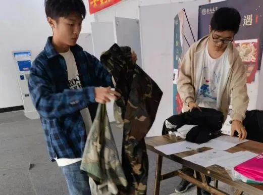 志愿者们在这两天的活动中,将同学们积极捐赠的旧军训服和各类旧衣物精心整理、分类和打包。