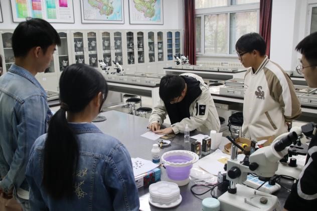 活动开始,外院同学对实验室陈列的化石标本表现出极大兴趣与热情,代金韬结合教学化石,讲解了古生物、化石、化石的类型等古生物基础知识,并解答外院同学的问题。