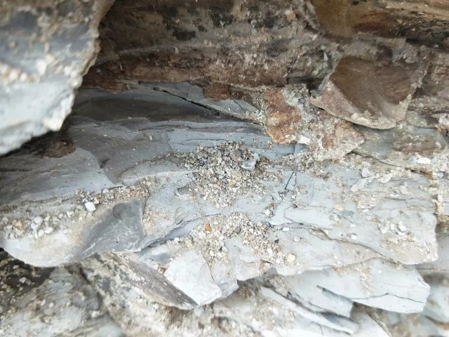 在第二站我们观察了姚家组剖面,此剖面主要由砖红色泥岩组成,夹紫色粉砂岩和介形虫层。在这里老师仔细的讲解了泥裂及其地质意义,同时向同学们介绍了正逆断层,并让同学们对断层进行素描。在姚家组也能采集到大量的介形虫化石,这些介形虫大小如同米粒,分布十分密集。