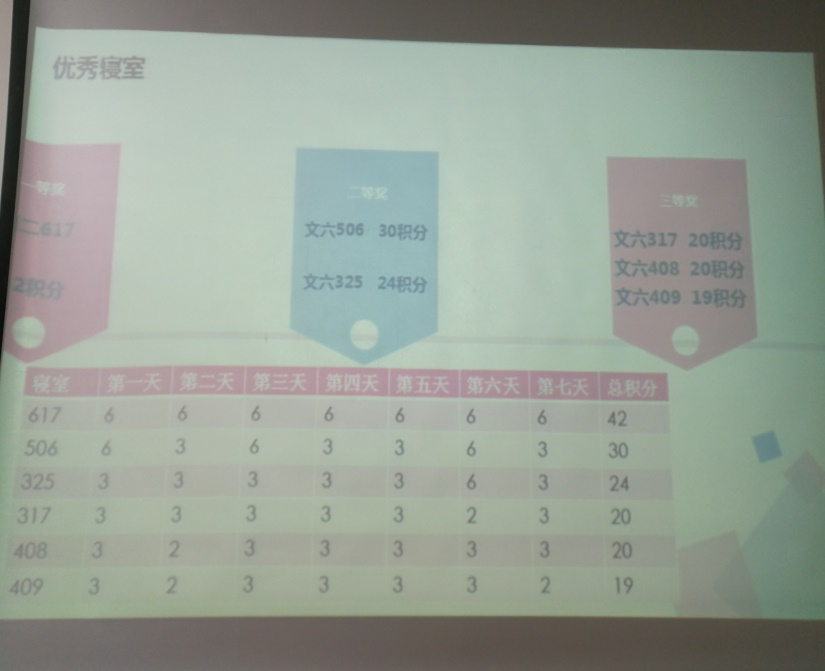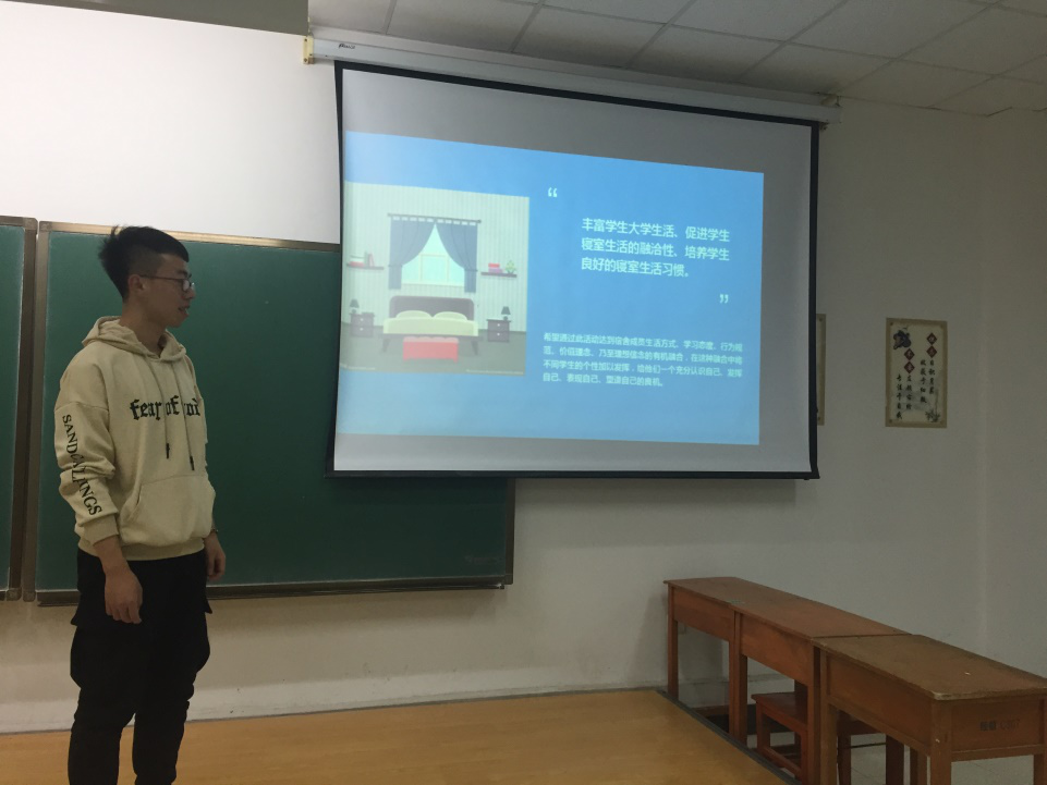 学生会工作人员早早到达教室,为接下来会议的召开做准备,十八点三十总结大会正式开始。首先由学生会生活部部长常磊为大家总结了此次活动的收获,接下来为同学们展示了表现突出的优秀寝室的照片。此次活动中南苑二公寓617宿舍获得一等奖,文苑六公寓506、325宿舍获得二等奖,文苑六公寓317、408、409宿舍获得了三等奖。最后常磊同学对获奖寝室提出了表扬,并为他们颁发了奖品与荣誉证书。